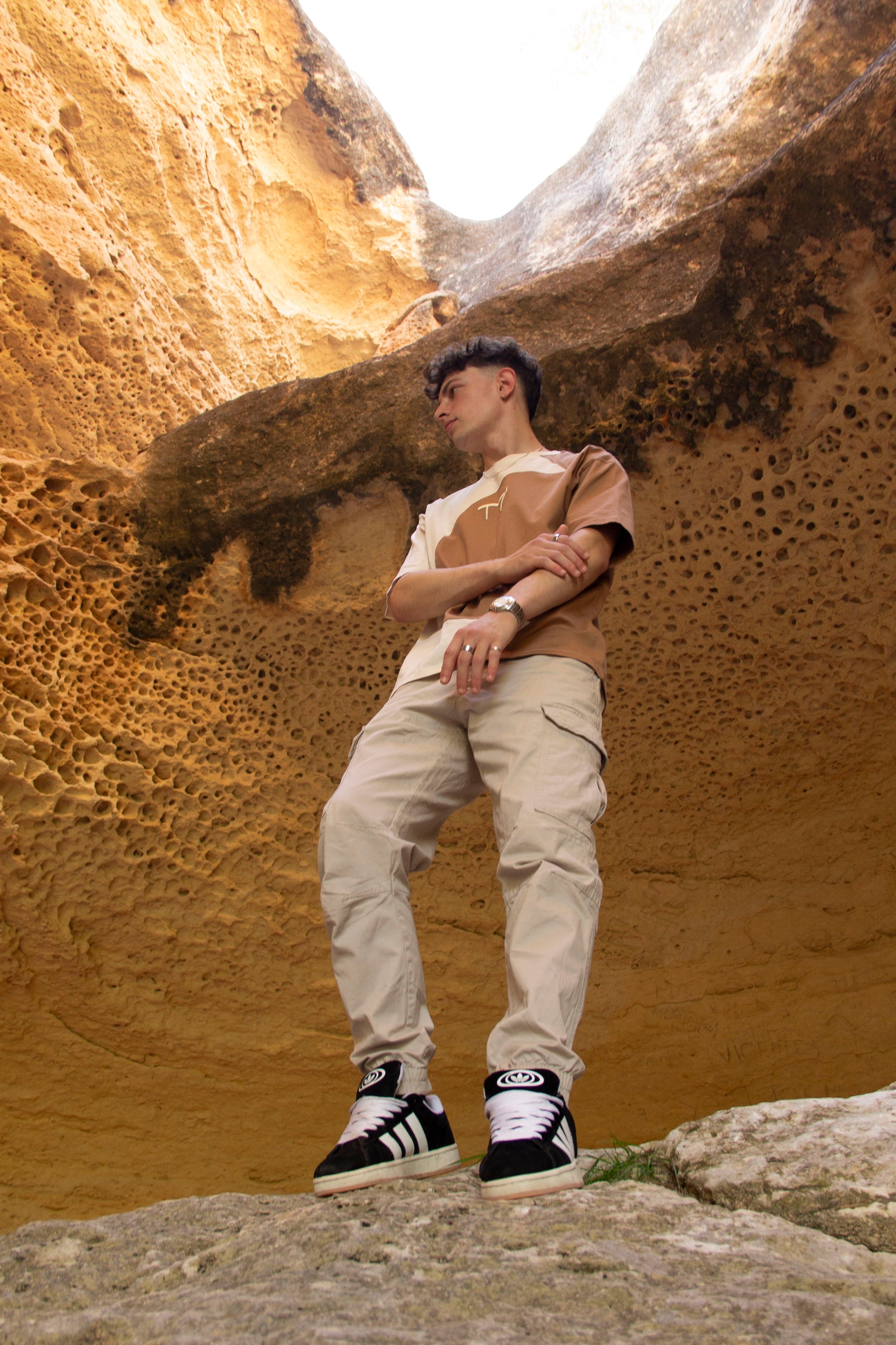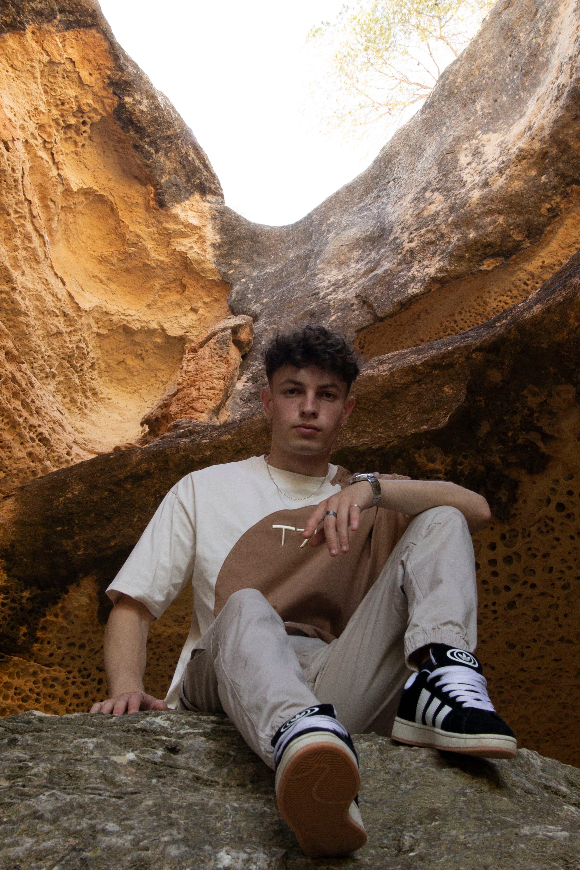 Camiseta oversize de algodón suave, con diseño cut & sew de media luna y logo T7’ en bordado 3D. Minimalista, estructurada y distintiva.